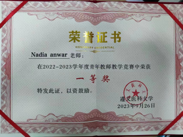Dr. Nadia Anwar, female, associate professor, graduated with a doctoral degree PhD in the major of Rehabilitation medicine from Chongqing Medical University.With richclinical and teaching experience inthefield of rehabilitation medicine, she haswon one national award in 2022 (third) and one provisional award in 2020 (third) for best research paper in youth English competitions.